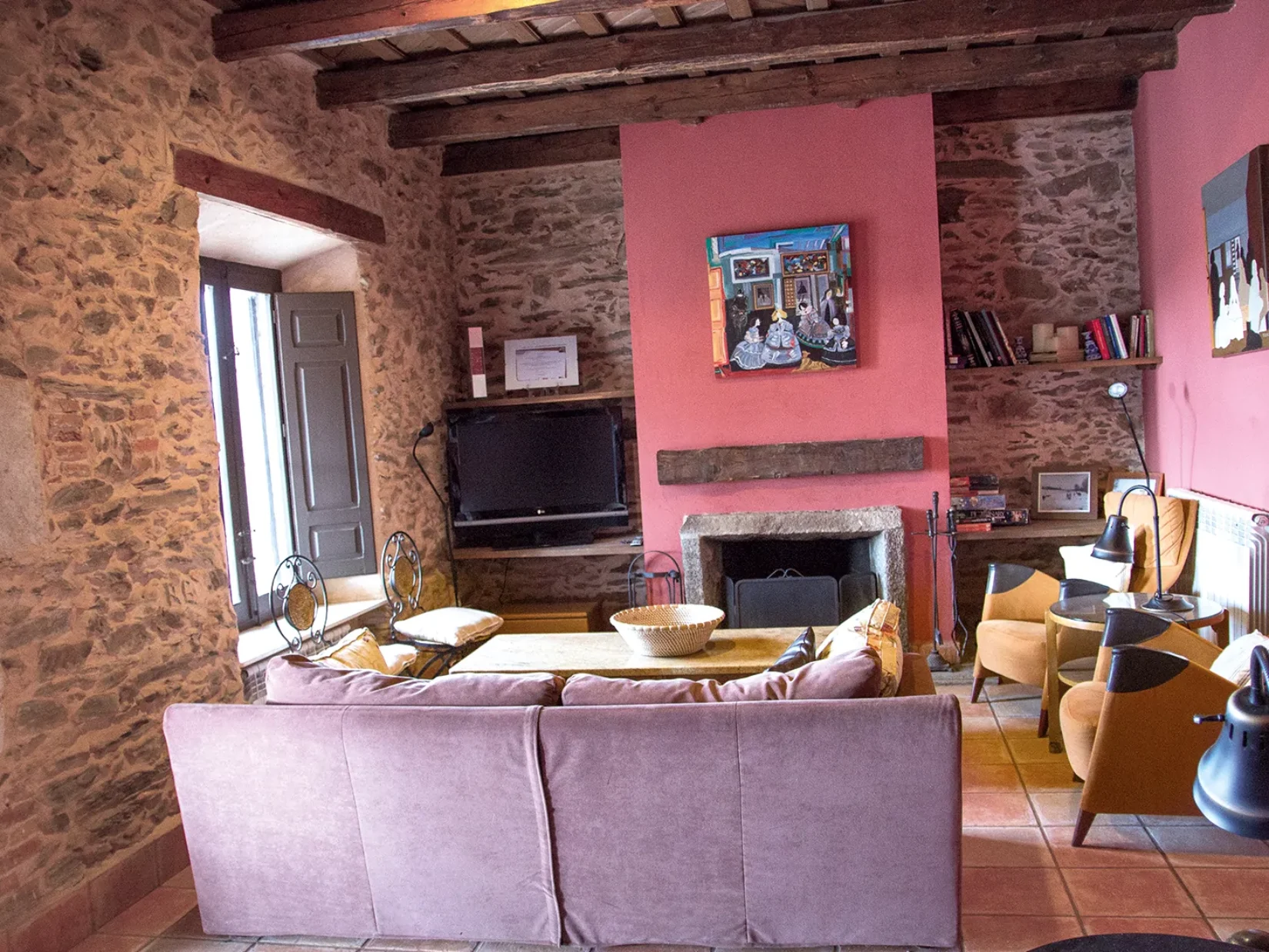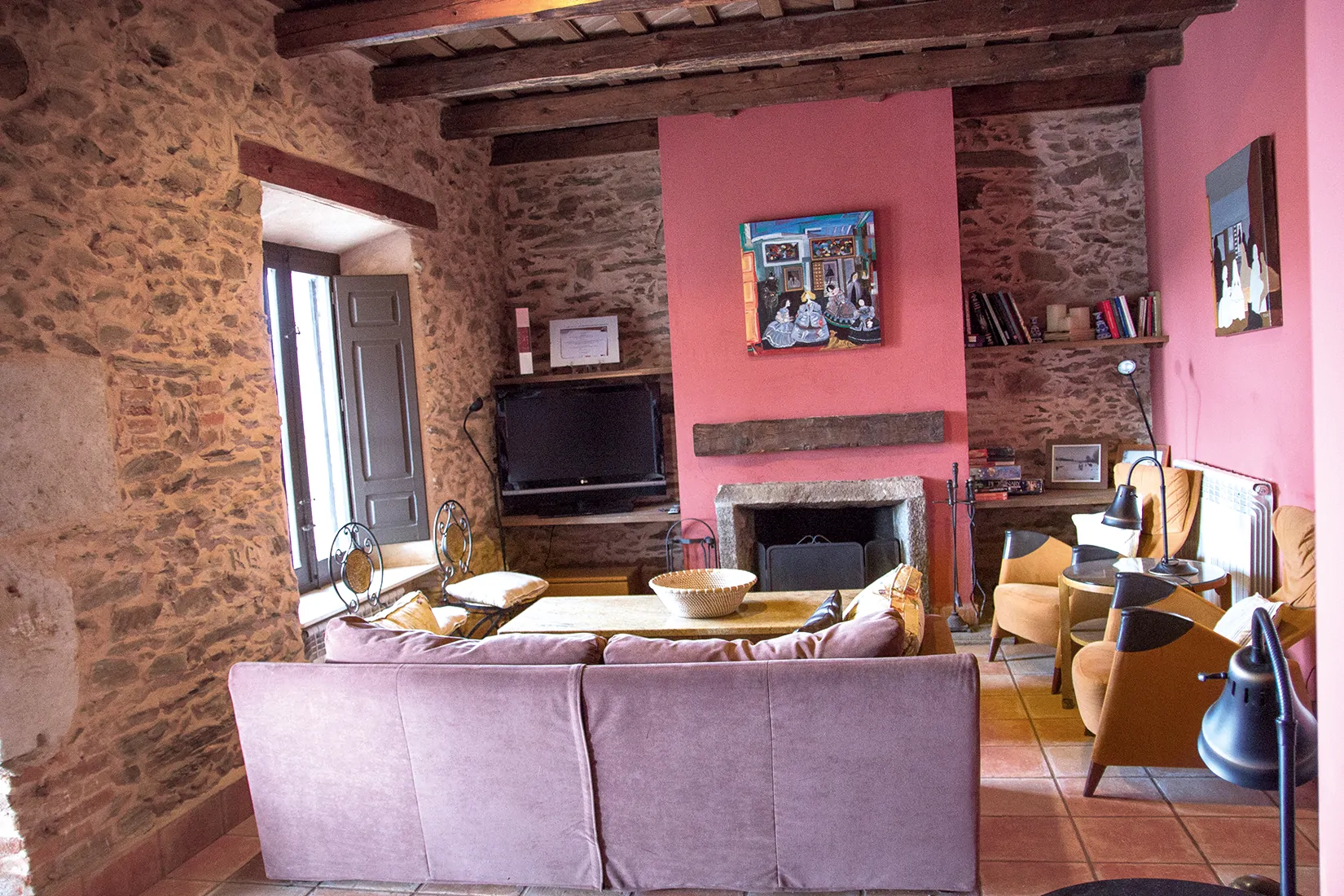 La sala de estar, con chimenea, muros de piedra y mobiliario confortable, es el corazón de la casa y un punto de encuentro ideal en cualquier época del año.